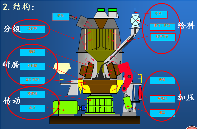 1、磨盤:包括導(dǎo)向環(huán)、風(fēng)環(huán)、擋料圈、襯板、盤體、 刮料板和提升裝置等。