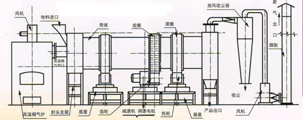 回轉(zhuǎn)式烘干機(jī)主要由回轉(zhuǎn)體、擋料板、傳動(dòng)裝置、支承裝置等部件組成。其工作原理:利用擺布合理,角度交替變更均布于筒體內(nèi)的揚(yáng)料板,把含水物料拋灑在旋轉(zhuǎn)的筒體內(nèi),經(jīng)熱氣流把水份從物料中分泌出來,變成水蒸氣排放于大氣中而進(jìn)行干燥。