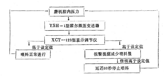 立磨機的飽磨主要是由以下幾方面的原因造成的:①喂料量太大;②排風(fēng)量太少;③選粉機故障。一旦磨機發(fā)生飽磨現(xiàn)象,電機將處于過載運行狀態(tài),所以必須設(shè)置保護裝置,以免燒壞電機。某些國產(chǎn)立磨機沒有飽磨保護裝置。對此問題同力重機建議可以采取了下面的保護措施:在磨腔側(cè)開一測壓孔,測量磨內(nèi)的負壓,根據(jù)磨腔內(nèi)負壓與物料多少成一定比例關(guān)系的原理,將此負壓通過一個YSH—1型霍爾微壓變送器轉(zhuǎn)換成毫伏信號,再將此信號輸入到一個XCT—123型的顯示調(diào)節(jié)儀中,當(dāng)磨內(nèi)負壓達到上限設(shè)定值(此值由實際測取,磨機型號不同此值不同)時,顯示調(diào)節(jié)儀中的繼電器接點動作,發(fā)出報警信號,提醒操作工減少喂料量。如果負壓繼續(xù)超過設(shè)定值延時60秒后,控制喂料器停止喂料,待磨內(nèi)負壓低于設(shè)定值時,喂料器又重新開始正常喂料。其原理如圖1所示。