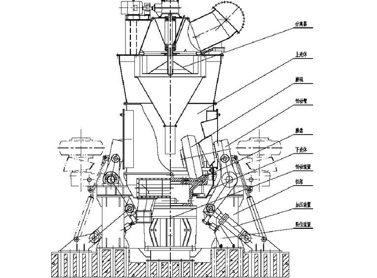 立磨機的主要結(jié)構(gòu)由分離器、磨輥裝置、磨盤裝置、加壓裝置、減速機、電動機、殼體等部分組成。分離器是決定磨粉產(chǎn)品粗細的重要部件,它由可調(diào)速的傳動裝置、轉(zhuǎn)子、導(dǎo)向風(fēng)葉、殼體、粗粉落料錐斗、出風(fēng)口等組成,是一種高效、節(jié)能、快捷的選粉裝置。磨輥是對物料進行碾壓粉磨的主要部件、它被裝在磨機的彎臂上,在外力的作用下,緊壓在磨盤的物料上,在磨盤的帶動下,磨輥隨之轉(zhuǎn)到,從而使物料被碾壓而粉碎。磨盤固定在減速機的輸出軸上,磨盤上部為料床,料床上有環(huán)形槽,物料就是在環(huán)形槽內(nèi)被磨輥碾碎的。加壓裝置時提供磨輥碾磨壓力的部件,它由高壓油站、液壓缸拉桿、蓄能器等組成,能向磨輥施加足夠的壓力使物料粉碎。減速機是傳遞動力的主要部件,磨盤的轉(zhuǎn)速就是減速機輸出抽的轉(zhuǎn)速。