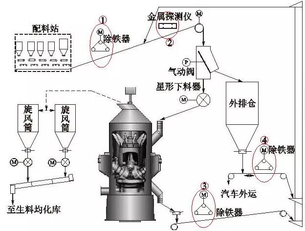 立磨金屬剔除、檢測(cè)與旁路系統(tǒng)由集散型計(jì)算機(jī)控制系統(tǒng)(DCS)、金屬探測(cè)儀、電磁式除鐵器、永磁式自卸除鐵器、旁路氣動(dòng)閥、外排倉等組成。