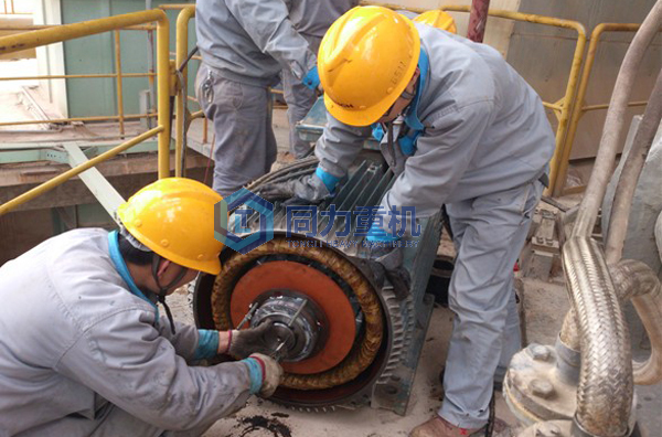 嚴(yán)格按采礦場立磨安裝標(biāo)準(zhǔn)進(jìn)行安裝。特別是在齒輪反面安裝后更要注意測量大齒圈的徑向和端面跳動(dòng)量、大齒圈與筒體的同軸度、大齒圈的對口間隙值等。然后應(yīng)用"壓鉛法"測量出與小齒輪的嚙合側(cè)隙以及小齒輪軸線與筒體中心線的平行度,全部檢驗(yàn)合格后才能進(jìn)行后試運(yùn)轉(zhuǎn)。 平時(shí)要嚴(yán)格執(zhí)行采礦場立磨設(shè)備點(diǎn)檢制度。檢修時(shí)嚴(yán)格執(zhí)行檢修標(biāo)準(zhǔn),保證檢修后各部件滿足裝配尺寸要求。設(shè)備在運(yùn)行一段時(shí)間后,要對各關(guān)鍵尺寸如齒輪間隙、小齒輪軸線與筒體中心線的平行度、小齒輪軸和電機(jī)軸同軸度等。