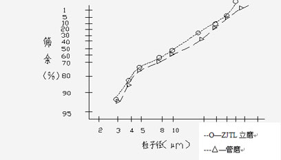 ZJTL輥式立磨機磨出的水泥制成灰漿需水量多一點,然比表面積比管磨水泥較低的情況下,凝結時間相同,抗壓強度高出15%,由此可見用ZJTL輥式立磨機磨出的水泥質量優(yōu)于管磨水泥質量。產(chǎn)品顆粒級配對比,結果基本相似。