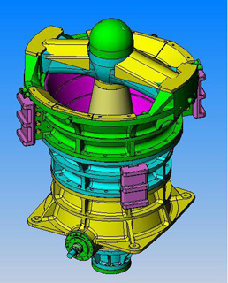 旋回破碎機(jī)由傳動、機(jī)座、偏心套、破碎圓錐、中架體、橫梁、原動、油缸、液壓、滑車、電氣和干、稀油潤滑等部分組成。電動機(jī)經(jīng)皮帶輪和圓錐齒輪帶動偏心套轉(zhuǎn)動,當(dāng)偏心套轉(zhuǎn)動時就帶動破碎圓錐繞破碎機(jī)中心作旋擺運動。從而使破碎圓錐表面時而靠近時而離開固定圓錐表面,使給入破碎腔內(nèi)的物料不斷受到擠壓和彎曲作用而被破碎。被破碎的物料靠自重從破碎腔底部排出。