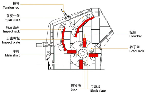 反擊式破碎機是一種利用沖擊能來破碎物料的破碎機械。機器工作時,在電動機的帶動下,轉子高速旋轉,物料進入板錘作用區(qū)時,與轉子上的板錘撞擊破碎,后又被拋向反擊裝置上再次破碎,然后又從反擊襯板上彈回到板錘作用區(qū)重新破碎,此過程重復進行,物料由大到小進入一、二、三反擊腔重復進行破碎,直到物料被破碎至所需粒度,由出料口排出